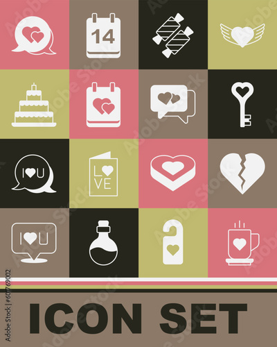 Set Coffee cup and heart, Broken or divorce, Key in shape, Candy, Calendar with, Wedding cake, Heart speech bubble and icon. Vector