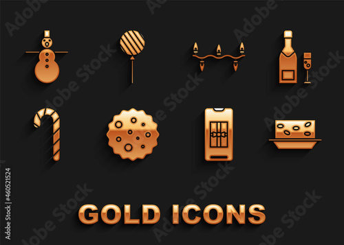 Set Cookie or biscuit with chocolate, Champagne bottle and glass of champagne, Nougat nuts, Smartphone gift box, Christmas candy cane stripes, lights, snowman and Lollipop icon. Vector