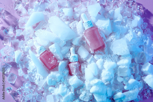 Set cosmetics bottles with ice cubes on frozen background