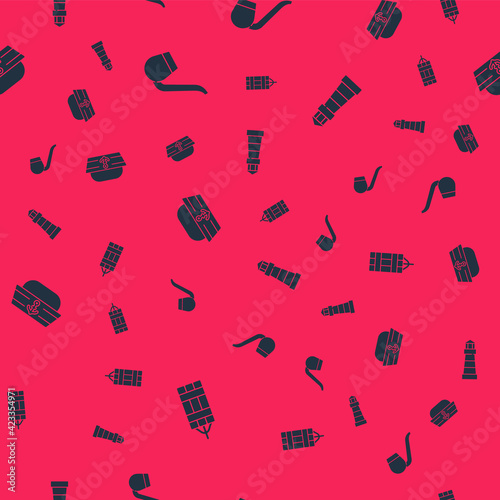 Set Dynamite bomb, Smoking pipe, Sailor hat and Lighthouse on seamless pattern. Vector