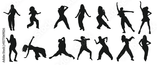 set female dancer silhouettes street dance with various different styles poses vector graphic.