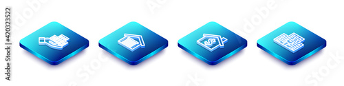 Set Isometric line Skyscraper, Garage, House with dollar symbol and icon. Vector