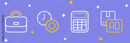 Set line Advertising, Calculator, Time management and Briefcase icon. Vector