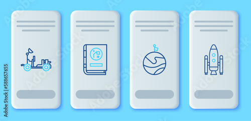 Set line Book by astronomy, Moon with flag, Mars rover and Space shuttle and rockets icon. Vector