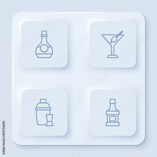 Set line Bottle of cognac or brandy, Martini glass, Cocktail shaker and Whiskey bottle. White square button. Vector
