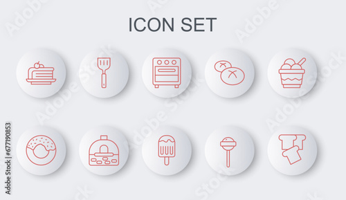 Set line Bread toast, Donut, Oven, Lollipop, Piece of cake, Spatula, Brick stove and Ice cream icon. Vector