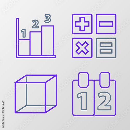 Set line Calendar, Geometric figure Cube, Calculator and Graph, schedule, chart, diagram icon. Vector