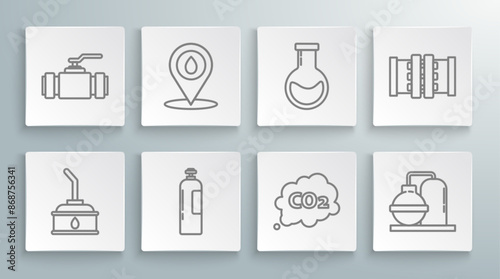 Set line Canister for motor machine oil, Industrial gas cylinder tank, CO2 emissions cloud, Oil and industrial factory building, Test tube flask, Industry metallic pipes valve and icon. Vector