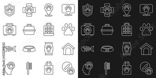 Set line Dog pill, house, Paw print, Location veterinary, Pet carry case, first aid kit, Animal health insurance and icon. Vector