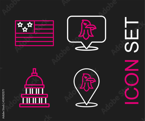 Set line Eagle, White House, and American flag icon. Vector