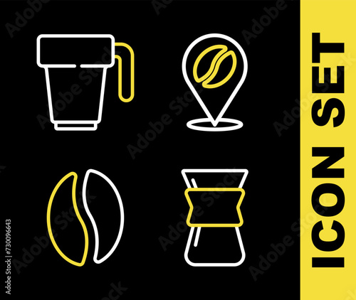 Set line Location with coffee bean, Pour over maker, Coffee beans and cup icon. Vector
