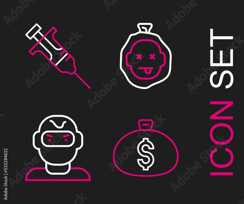 Set line Money bag, Thief mask, Murder and Syringe icon. Vector