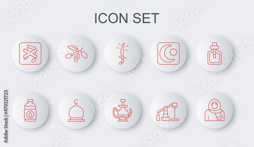 Set line Muslim woman in hijab, Bottle of water, Arabian saber, Oil pump or pump jack, Speaker mute, Date fruit, Mosque and Hookah icon. Vector