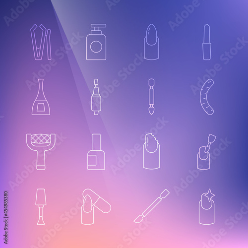 Set line Nail manicure, Milling cutter for, file, Bottle of nail polish, and Cuticle pusher icon. Vector