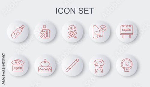 Set line Stop smoking, money saving, Hypnosis, Bones and skull, Tooth with caries, Electronic cigarette, No electronic, Heartbeat increase and Cigarette icon. Vector