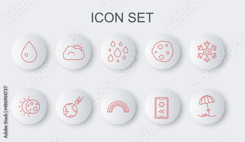 Set line Sun protective umbrella for beach, Eclipse of the sun, Water drop, Weather forecast, and cloud, Comet falling down fast and Rainbow icon. Vector