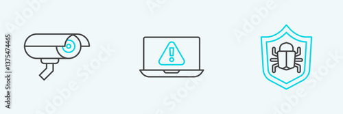 Set line System bug, Security camera and Laptop with exclamation mark icon. Vector