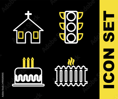 Set line Traffic light, Heating radiator, Cake with burning candles and Church building icon. Vector