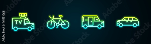 Set line TV News car, Bicycle, Minibus and Hatchback. Glowing neon icon. Vector
