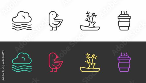 Set line Windy weather, Little chick, Bare tree and Coffee cup to go on black and white. Vector