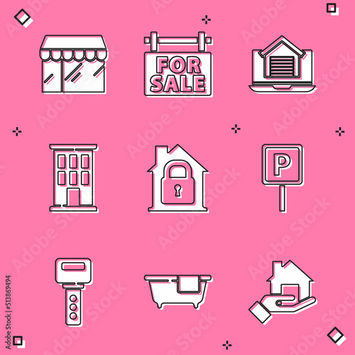 Set Market store, Hanging sign with For Sale, Online real estate house, House, under protection, Parking, key and Bathtub icon. Vector