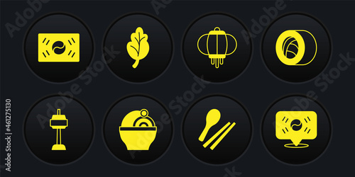 Set N Seoul tower in South Korea, Sushi, Ramen, Food chopsticks, Korean lantern, Kimchi, Location and flag icon. Vector