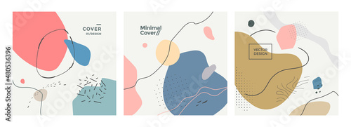 Set of abstract geometric backgrounds. Memphis various shapes and doodle objects. Square art modern trendy vector illustrations. Pastel colors covers for social media networks.