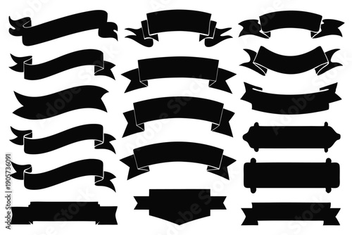 set of black banner ribbon silhouette line art vector illustration with a white background