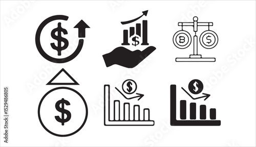 Set of Black Financial Growth Icons with Dollar Signs and Bar Charts – Vector Illustration eps 10