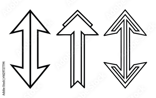 Set of black outlined up and down arrows with bold geometric design isolated on white background