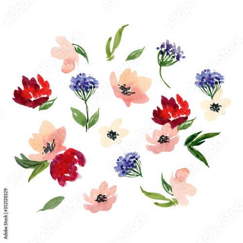 Set of blossom vector spring and summer flowers. Watercolour illustration. Peony, roses, anemone, hellebore