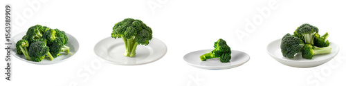 Set of broccoli pieces served on white plates isolated on transparent background
