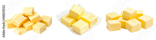 Set of butter cubes stacked on piece of paper isolated on white background. Concept of dairy products and cooking ingredients