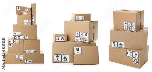 Set of cardboard boxes with packaging symbols on white background. Banner design