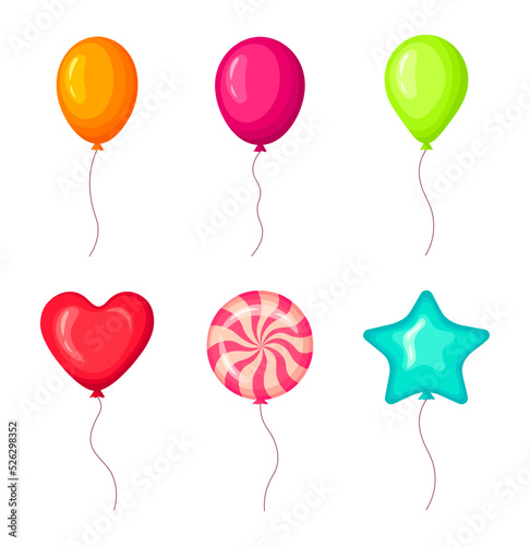 Set of carnival balloons isolated on white background.Festive set of colorful balloons in different shapes.Cute orange, pink, green and heart, spiral caramel candy, star air ballons.