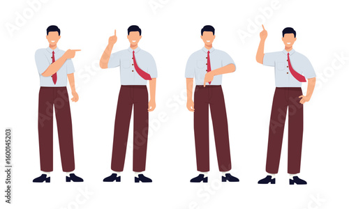Set of character. Handsome Businessman showing and pointing fingers upper left and right corner with happy expression advices use this copy space. Vector illustration.