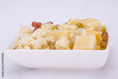 Set of cheeses and grapes on a white background