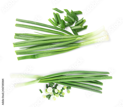 Set of cut green onions on white background, top view