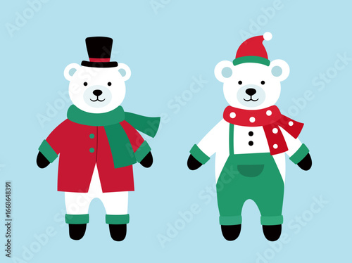 Set of cute Christmas white polar bears characters flat vector stock illustration. Polar bear in clothes clipart. Design for greeting card, poster, invitation.