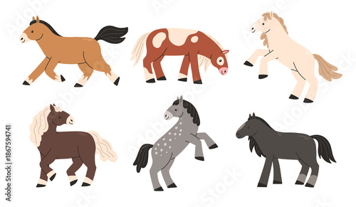 Set of cute horses in a flat cartoon style isolated on a white background.