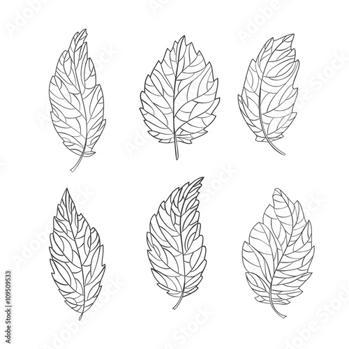 Set of decorative leaves drawn by hand. Monochrome gamma .
