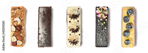 Set of different delicious cakes on white background, top view