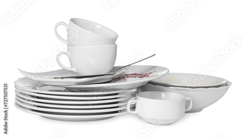 Set of dirty dishes isolated on white