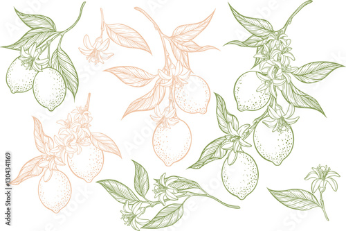 Set of doodle clip art of lemon tree and flowers. Vector illustration.