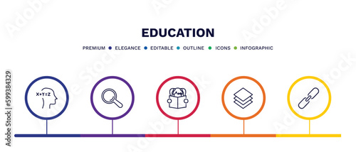 set of education thin line icons. education outline icons with infographic template. linear icons such as equation, magnification lens, reading book, arrange, binding vector.