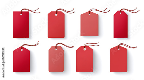 Set of eight red blank price tags with strings, isolated on white background. Perfect for promotions, sales, discounts, or branding design projects.