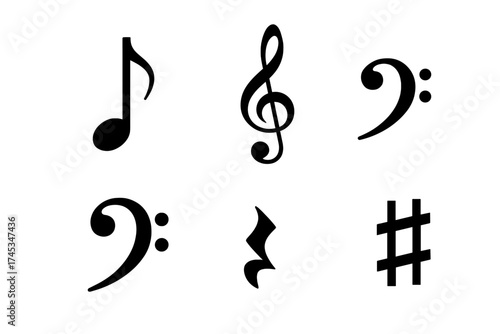 Set of essential musical notation symbols including clefs, notes, rests, and sharp signs