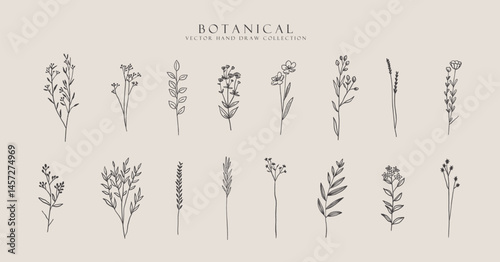 Set of flowers and plants trendy botanical elements. Hand drawn line minimalistic set, black