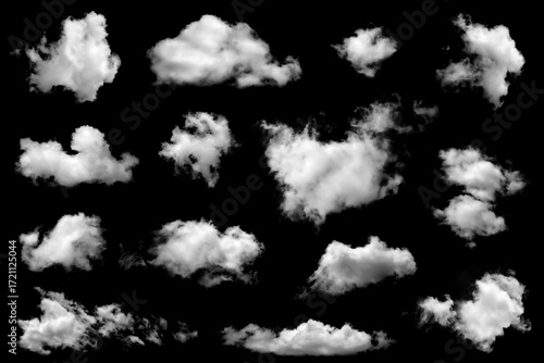 Set of fluffy white cloud shapes isolated on a black background, ideal for sky design, weather illustration, photo editing, fantasy scenes, and creative digital artwork in high resolution.
