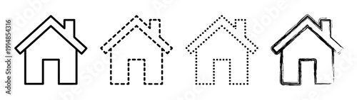 Set of four black house icons with different outline styles including solid, dashed, dotted, and a hand-drawn brush stroke effect for real estate or web design